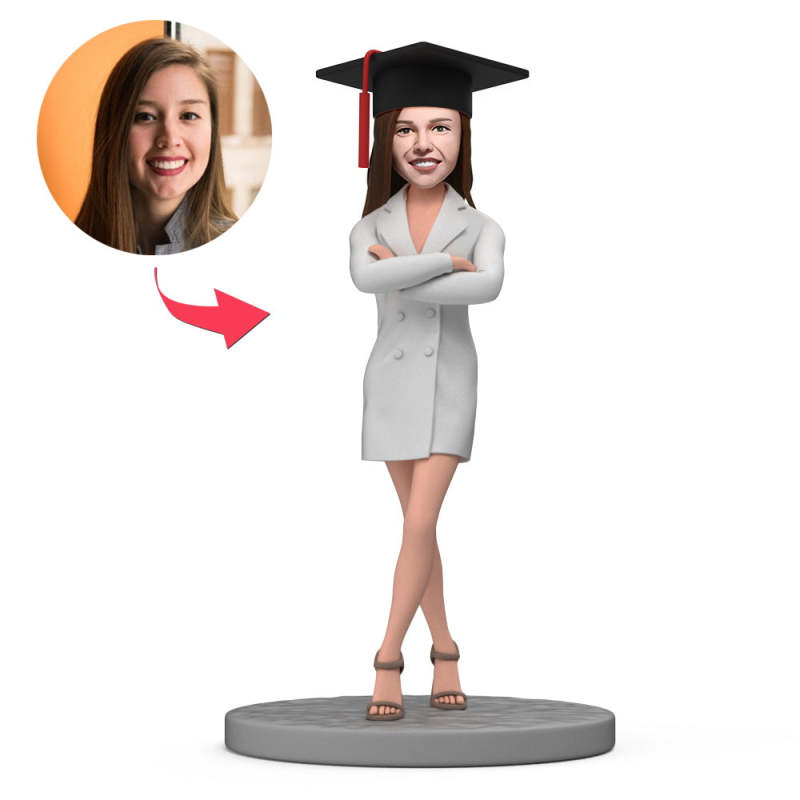 Custom Bobbleheads for Graduation Female in White Dress with Bachelor Cap