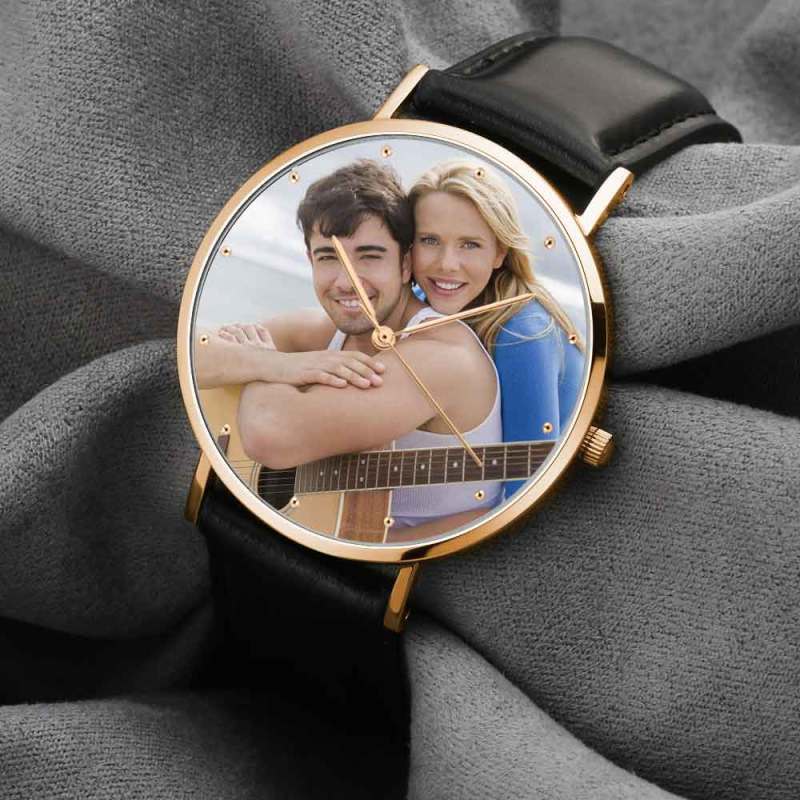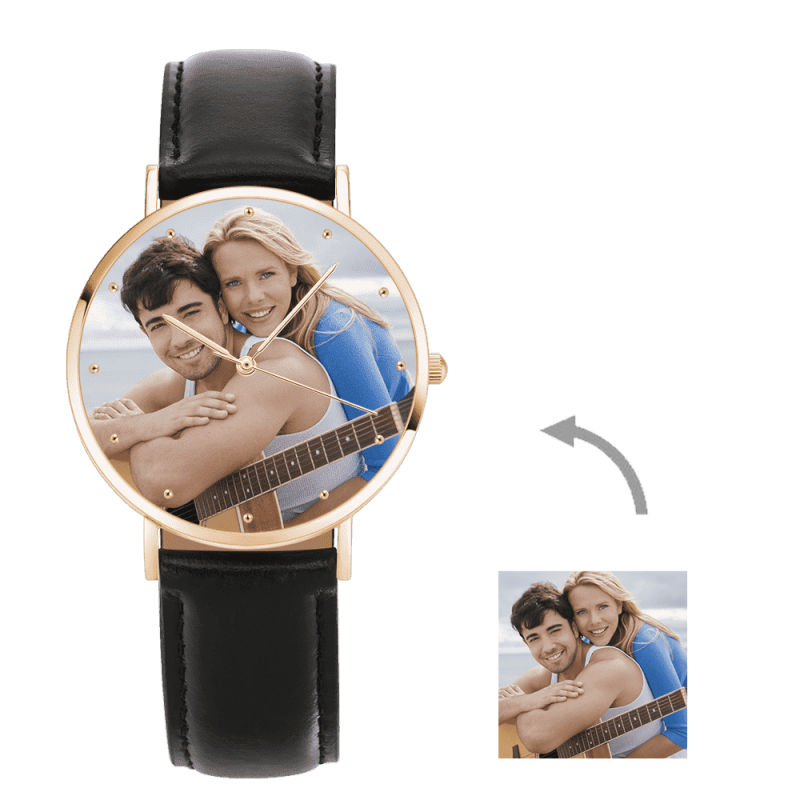 Custom Engraved Rose Gold Photo Watch Black Leather Strap For Men's Gift - 40mm