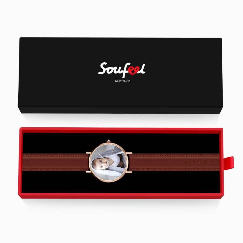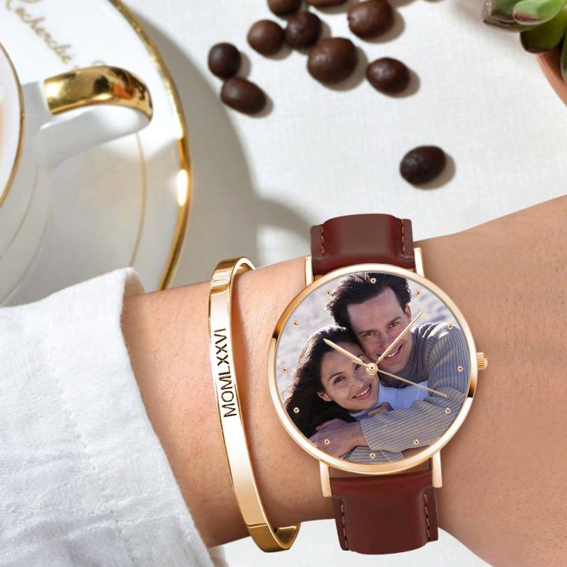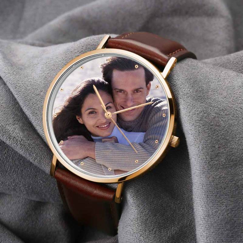 Custom Engraved Rose Gold Photo Watch Brown Leather Strap For Men's Gift - 40mm