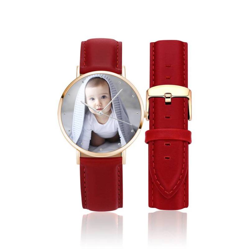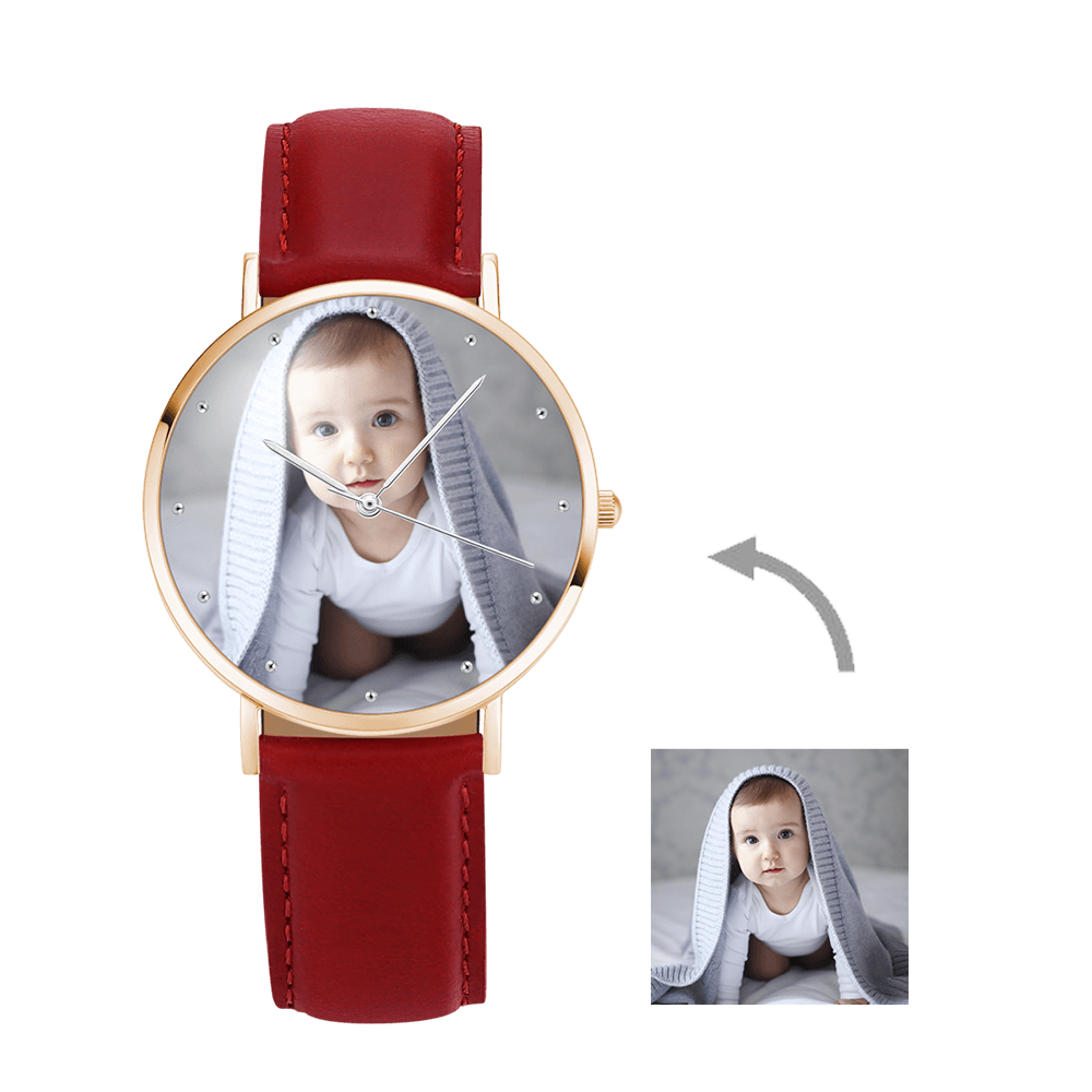 Custom Engraved Rose Gold Photo Watch Red Leather Strap For Women's Gift - 36mm