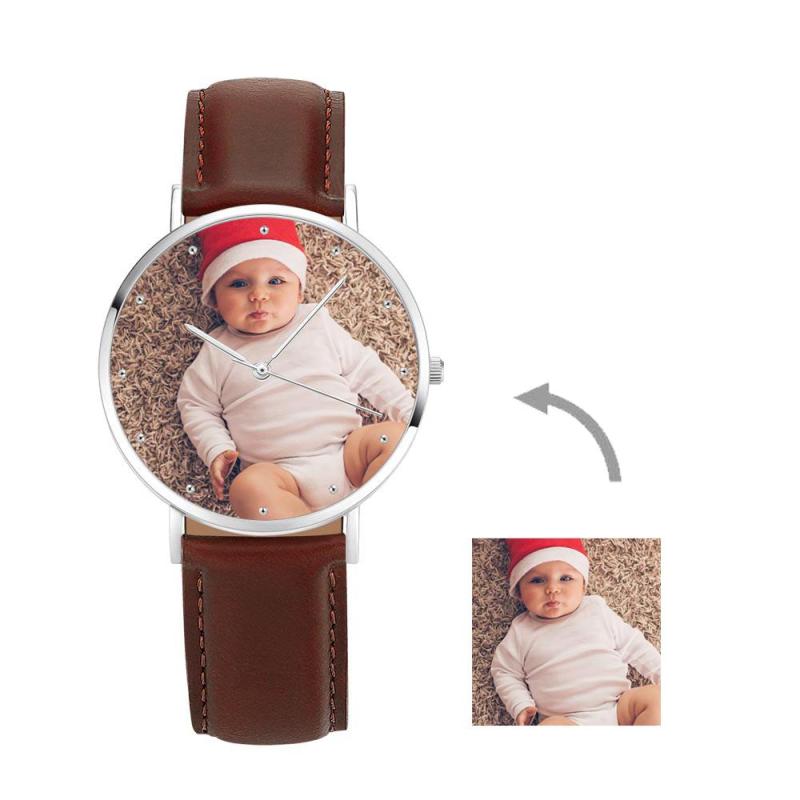 Custom Engraved Silver Photo Watch Brown Leather Strap For Women's Gift - 36mm