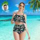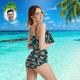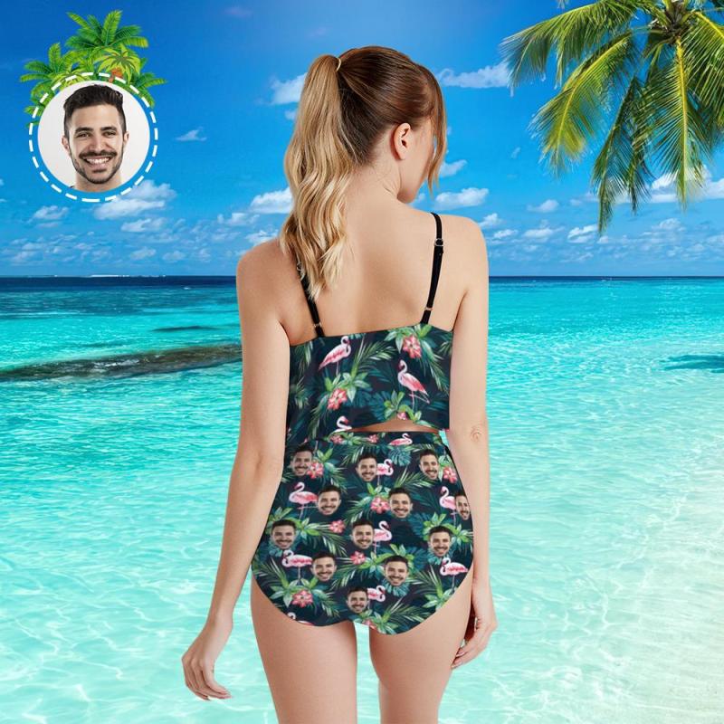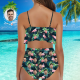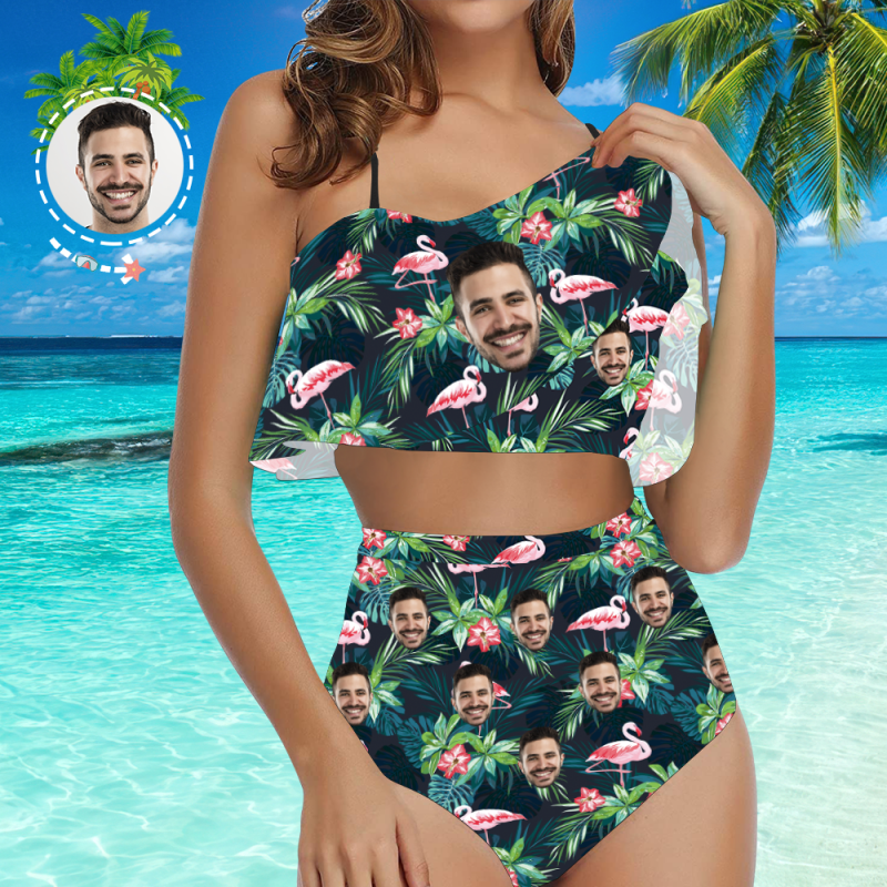 Custom Face Bikini Women's Ruffle Summer Bikini High Waisted Bathing Suits Gift For Her - Leaves & Flamingo