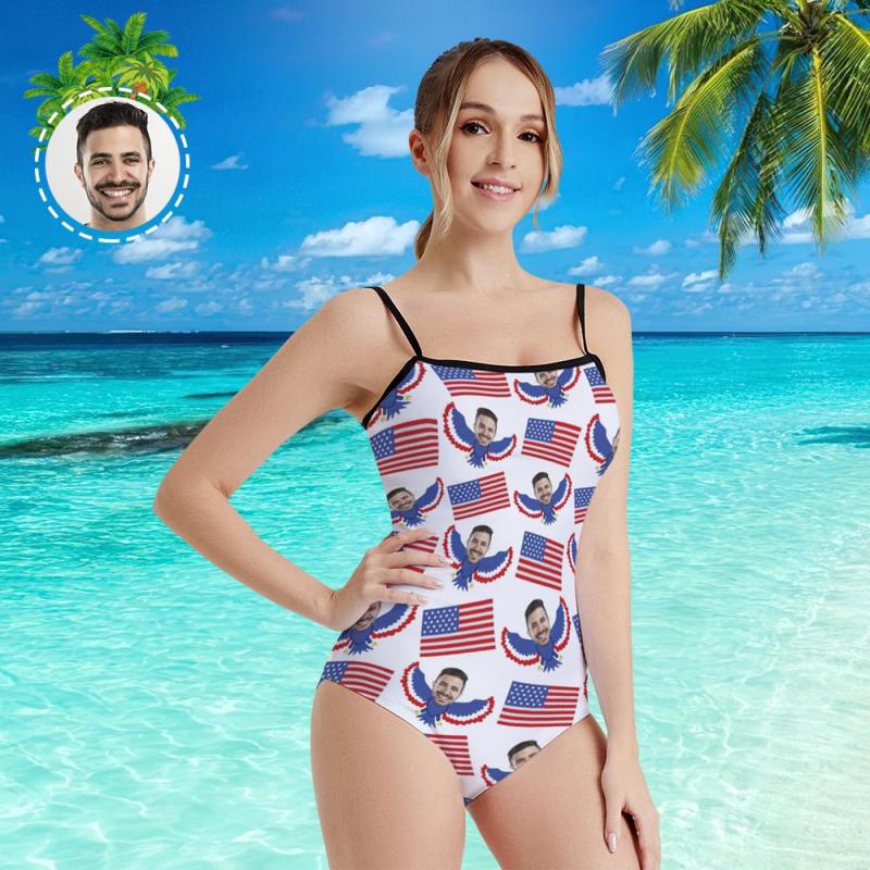 Custom Face Swimwear Women's Photo Slip One Piece Swimsuit- USA Flag With Bald Eagle