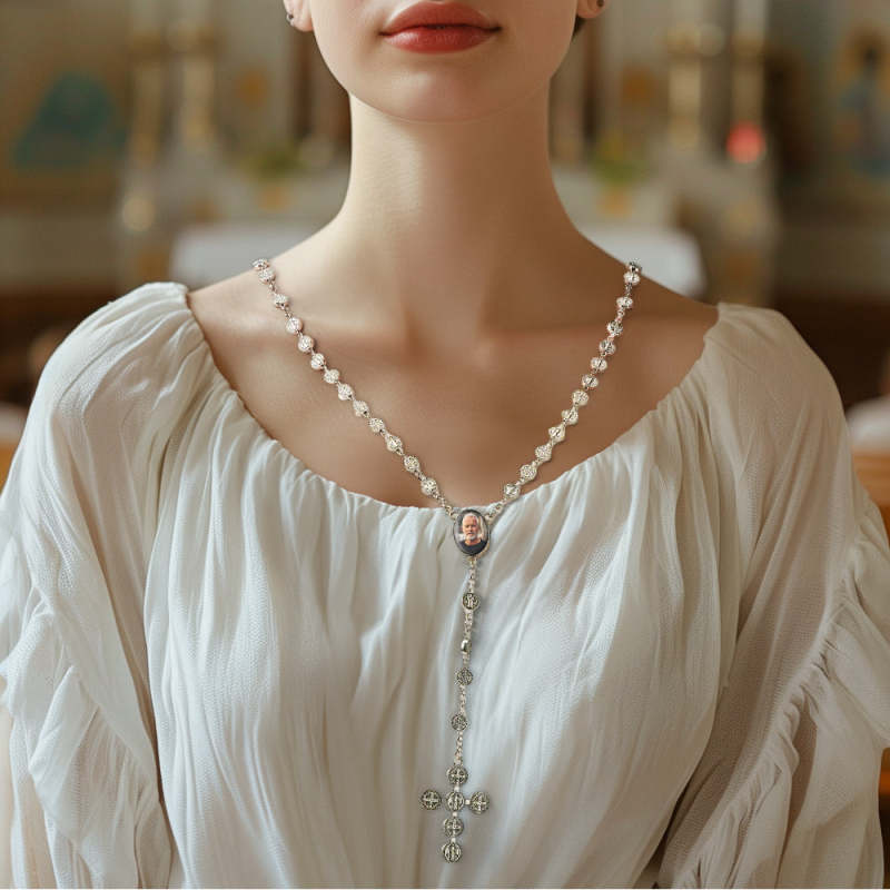 Custom Rosary Beads Cross Necklace Personalized Vintage Alloy Beads Necklace with Photo