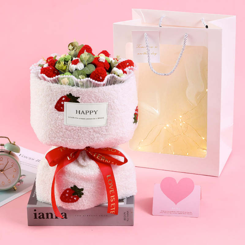 Crochet Flowers Bouquet Handmade Knitted Strawberry Bouquet with Light Strip Gift for Lovers Graduation Gift