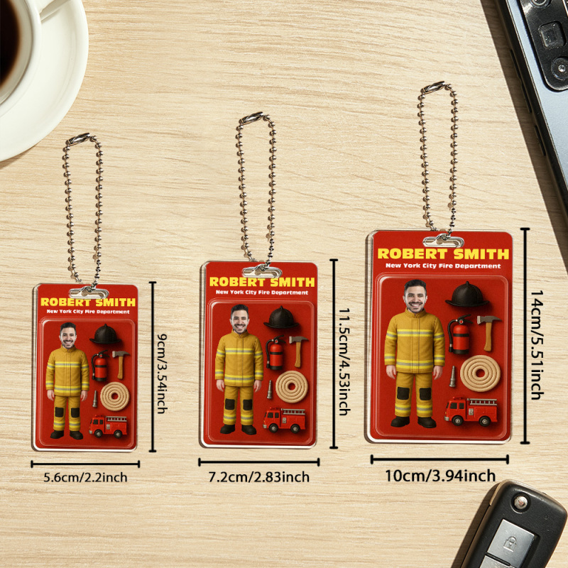 Custom 3D Effect Action Figure Customizable Head Packaging Toy Box Style Art Gift Personalized Acrylic Car Hanger Gift for Firefighter