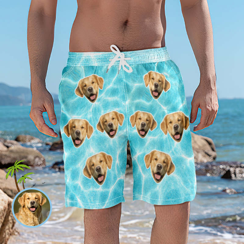 Custom Beach Short with Face Blue Wavy Texture Personalized Photo Swim Trunks for Men