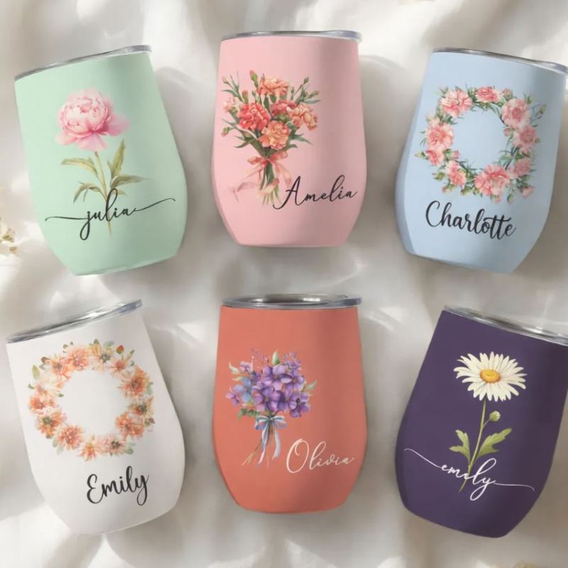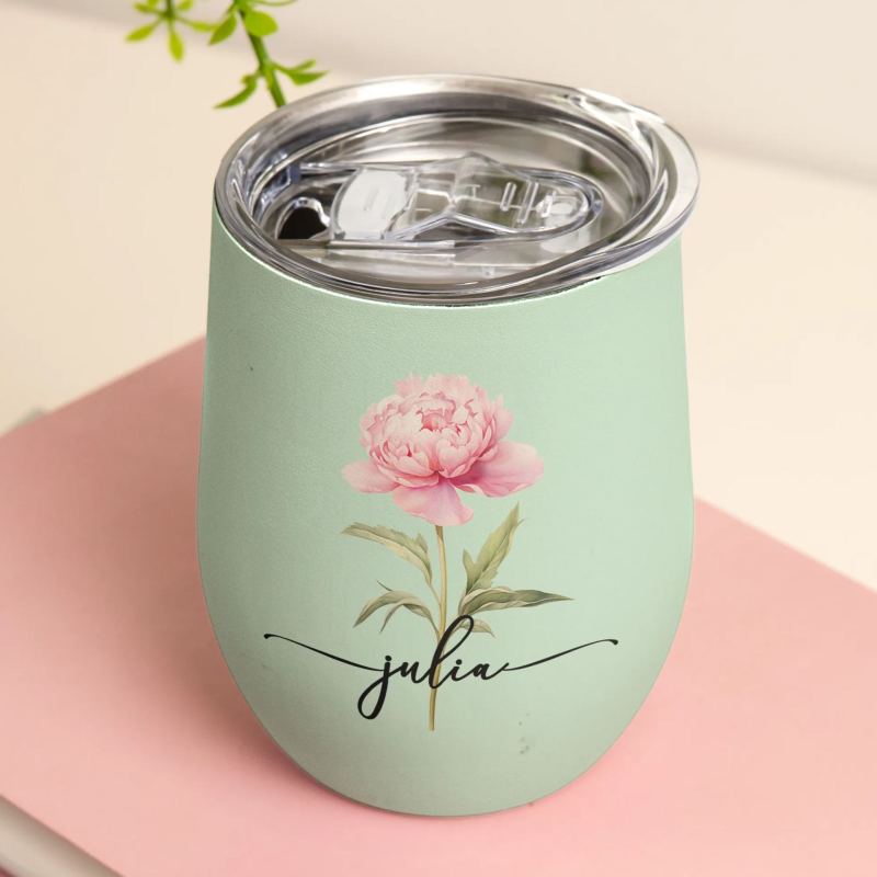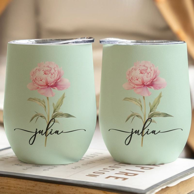 Custom Birth Flower Wine Tumbler for Her - Personalized Name Gift
