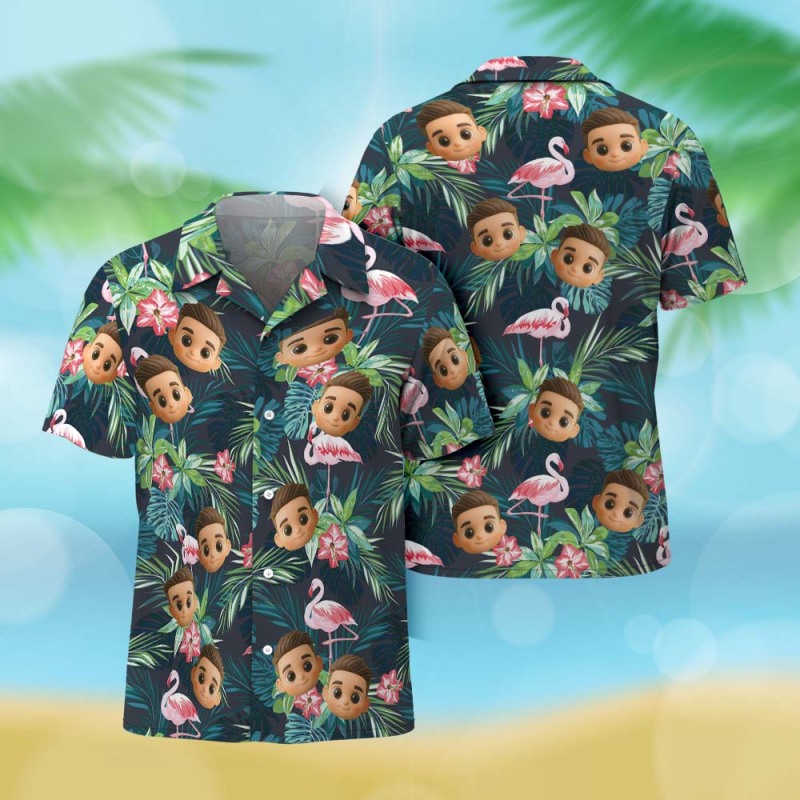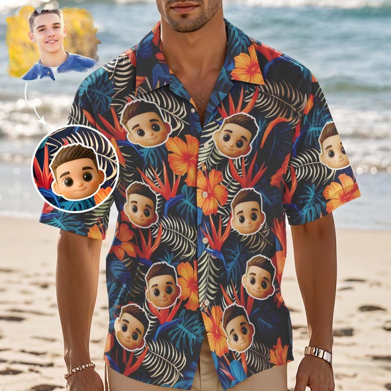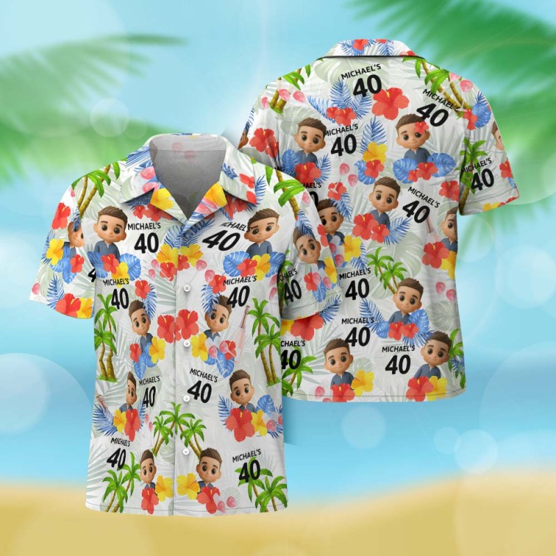 Custom Cartoon Date and Name Birthday Face Hawaiian Shirt Red Flower and Palm Tree Hawaiian Shirt