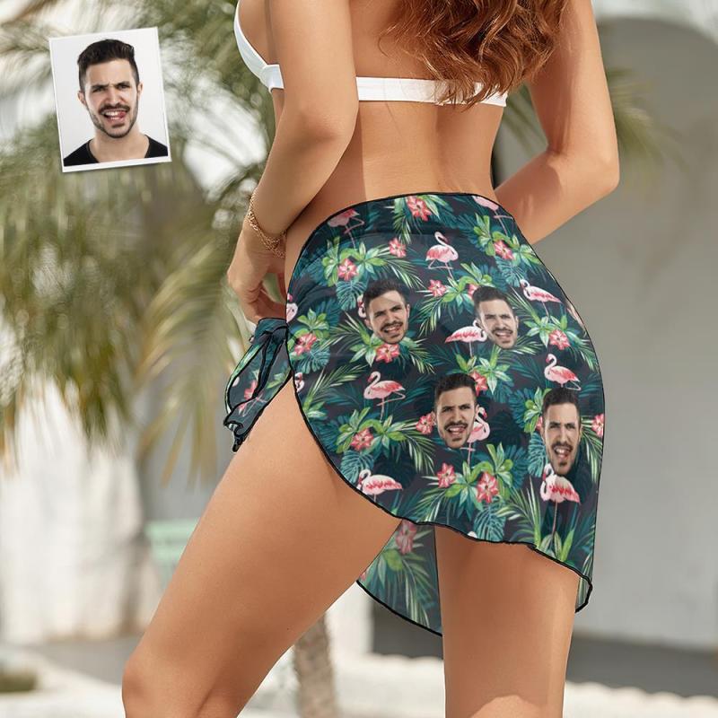 Custom Face Beach Wrap Women Short Sarongs - Flamingo Flowers And Leaves