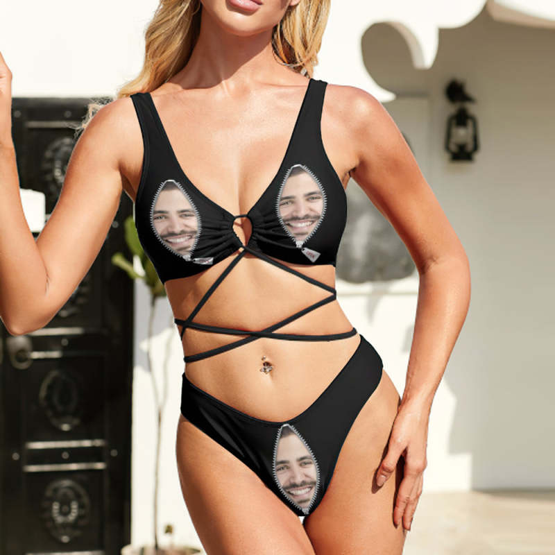 Custom Face Bikini Swimming Costume Women's Chest Strap Bathing Suit Personalized Photo Bikini Gift - Zipper