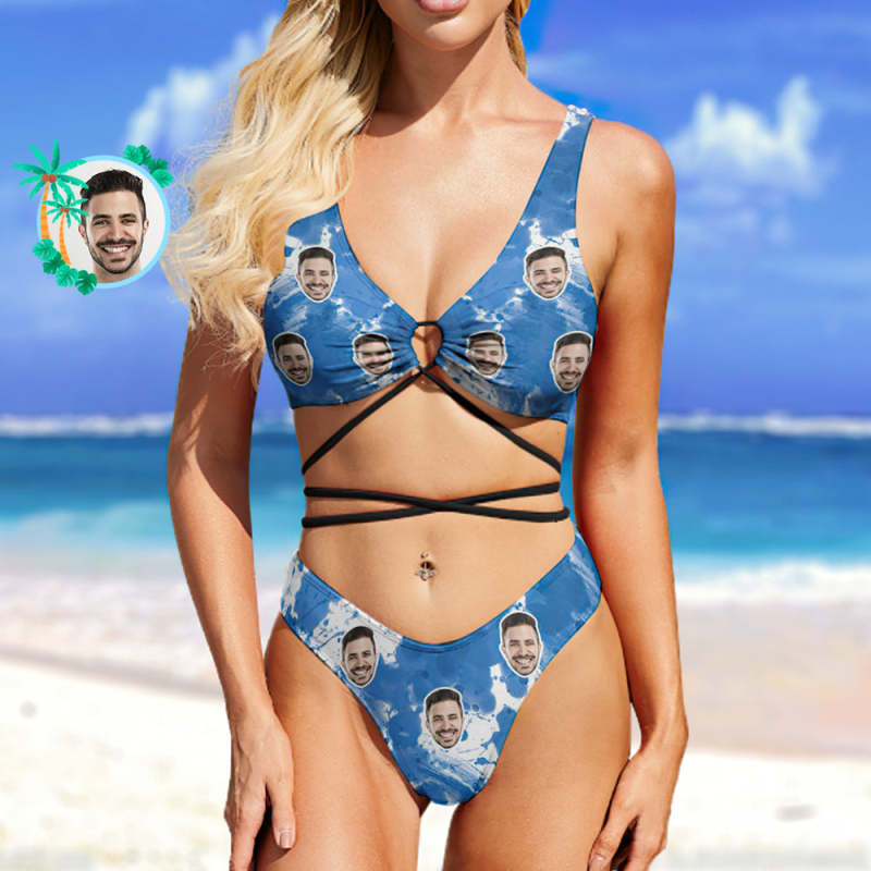 Custom Face Bikini Swimming Costume Women's Chest Strap Bathing Suit Personalized Photo Blue Bikini Gift for Girlfriend or Wife
