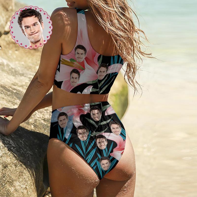 Custom Face Bikini Women's Chest Strap Bathing Suit Personalized Photo Bikini Anniversary Gift - Pink Lily