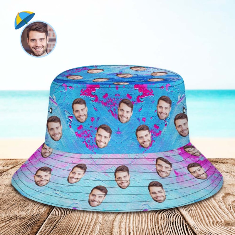Custom Face Bucket Hat Unisex Personalized Photo Wide Brim Outdoor Summer Hats Blue and Pink Oil Painting Style