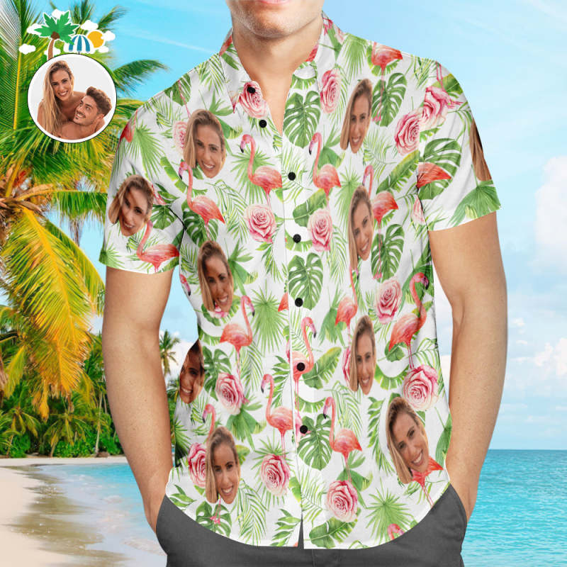 Custom Face Hawaiian Shirts Personalized Flamingo Shirts Couple Casual Short Sleeve Valentine's Day Gift