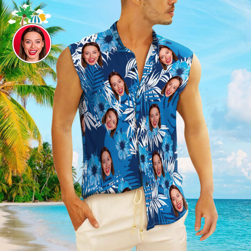 Custom Face Men's Sleeveless Hawaiian Shirts Personalized Blue Sleeveless Shirts For Men