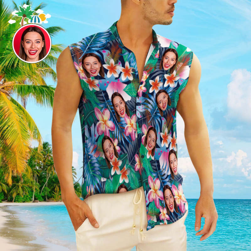 Custom Face Men's Sleeveless Hawaiian Shirts Personalized Sleeveless Shirts For Men Colorful Flowers