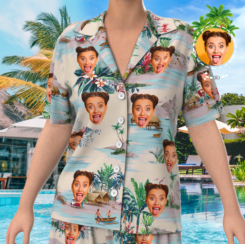 Custom Face On Pajamas Set, Short Sleeve Sleepwear, Button-Down Nightwear - Landscape Pattern
