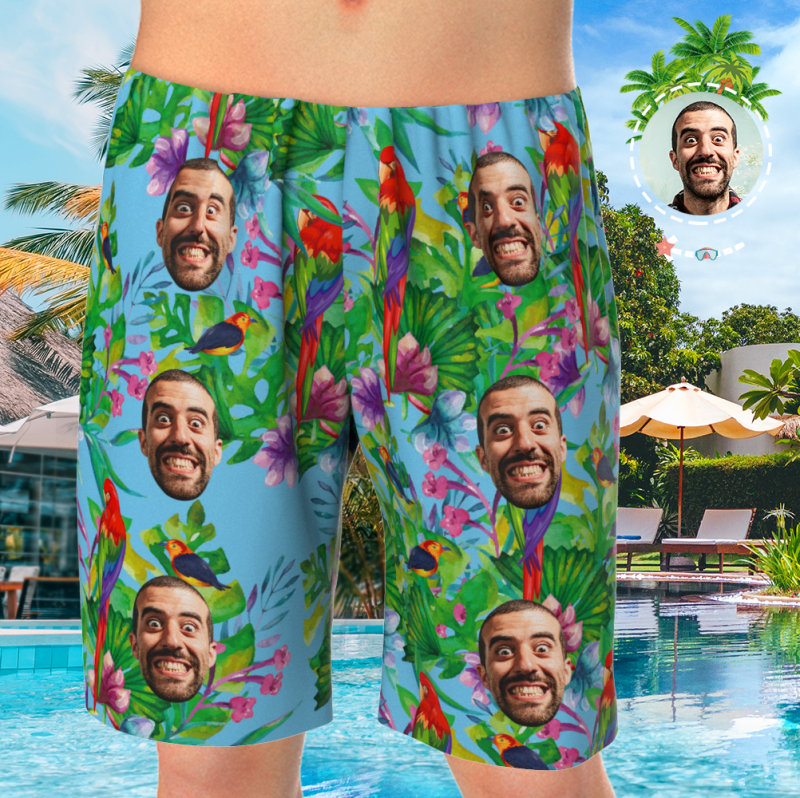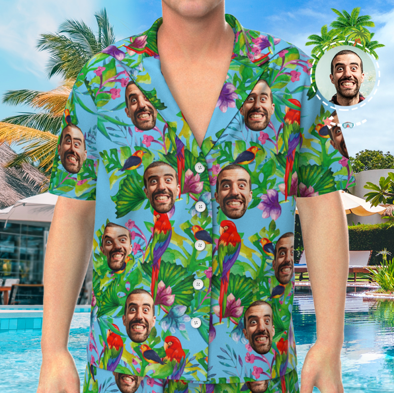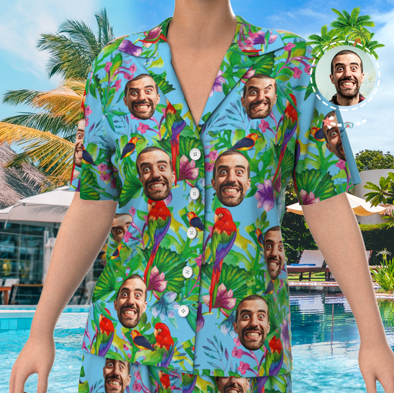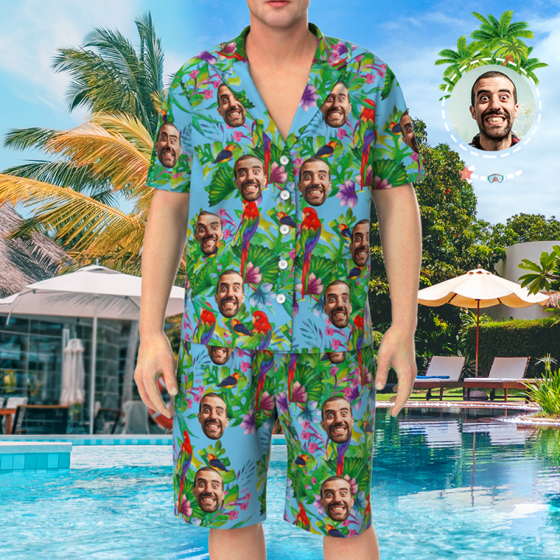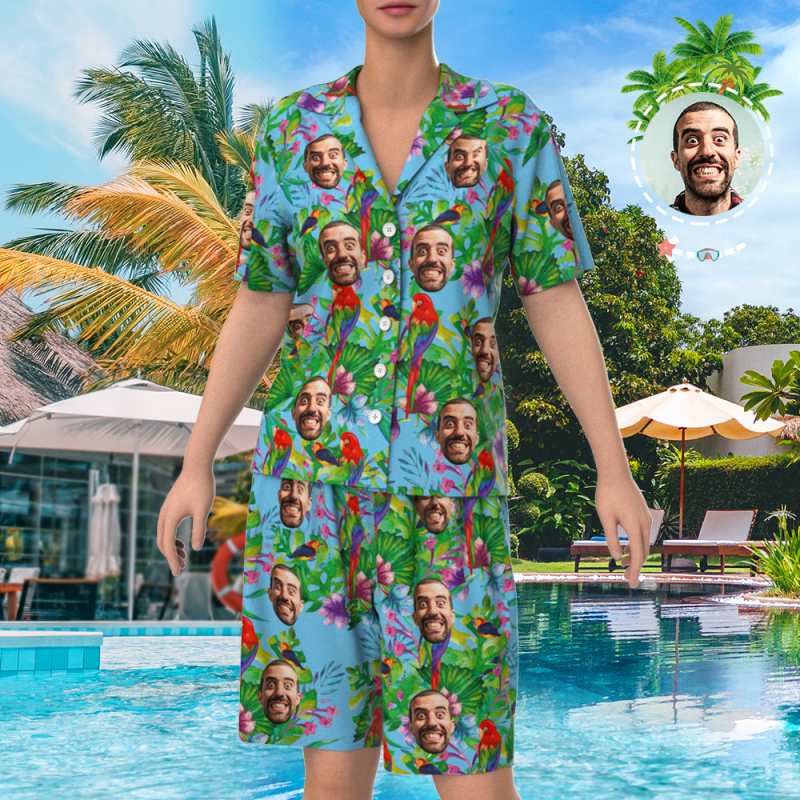 Custom Face On Pajamas Set, Short Sleeve Sleepwear, Button-Down Nightwear - Parrot