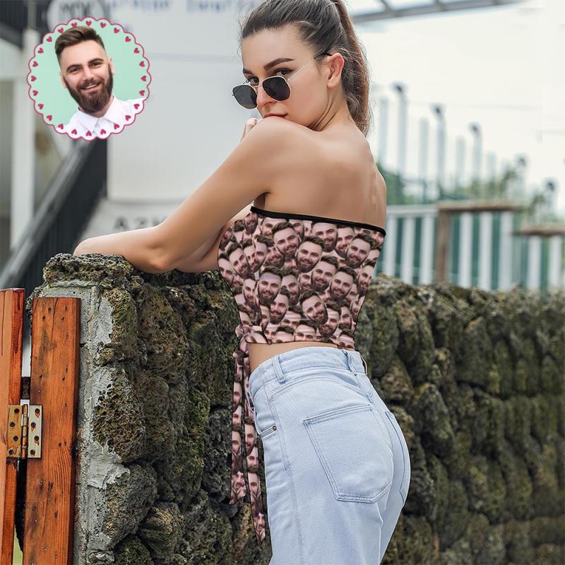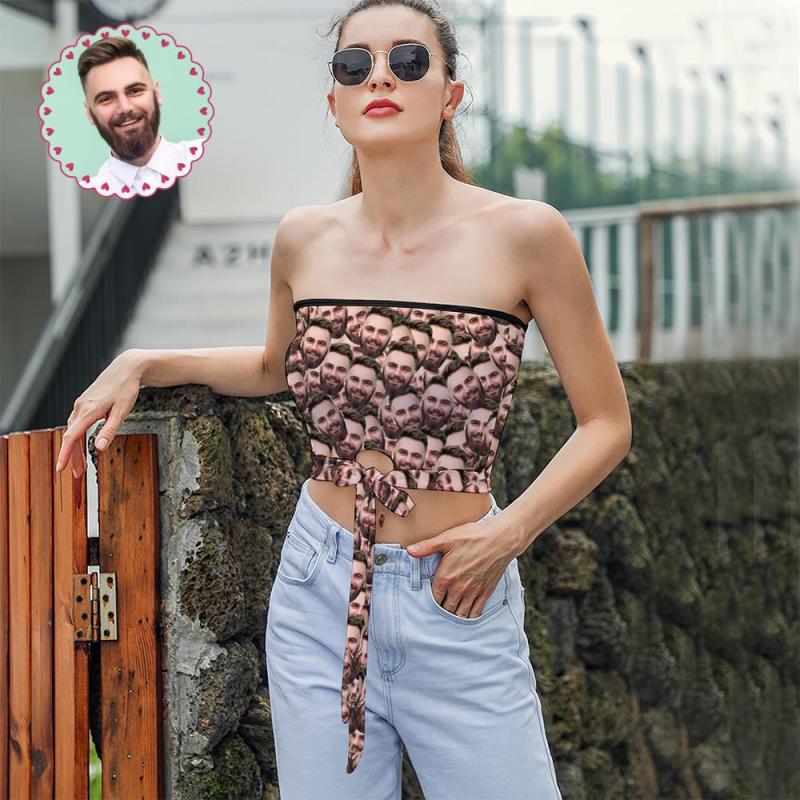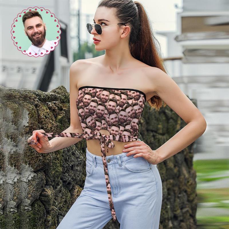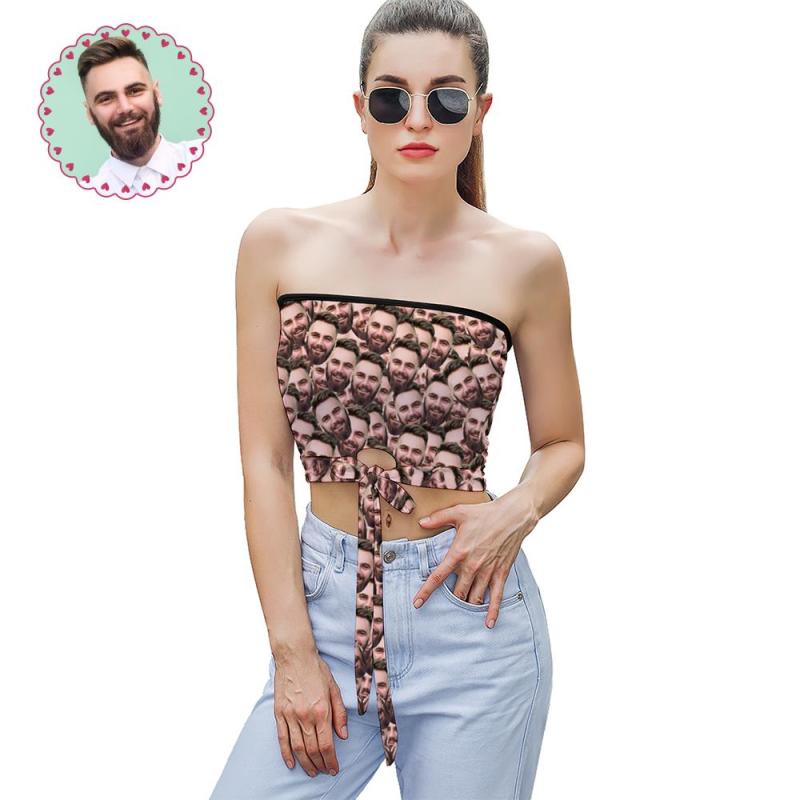Custom Face on Women's Strapless Bow Tube Top Personalized Breast Wrap Bikini Tops Faces Mash Tank Top with Photo Family Photo Go to Beach Perfect Gift for Wife