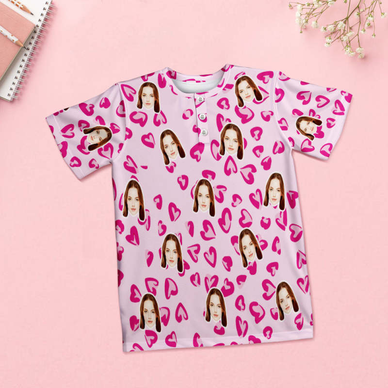 Custom Face Pajamas Women Blue Short Pajama Set Gift Pink Heart