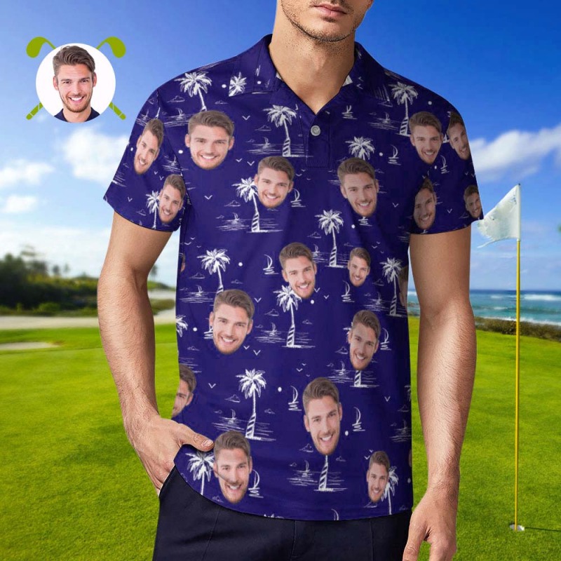 Custom Face Polo Shirt For Men Coconut Tree Island Personalized Hawaiian Golf Shirts