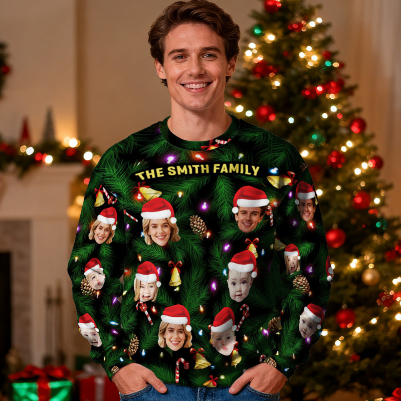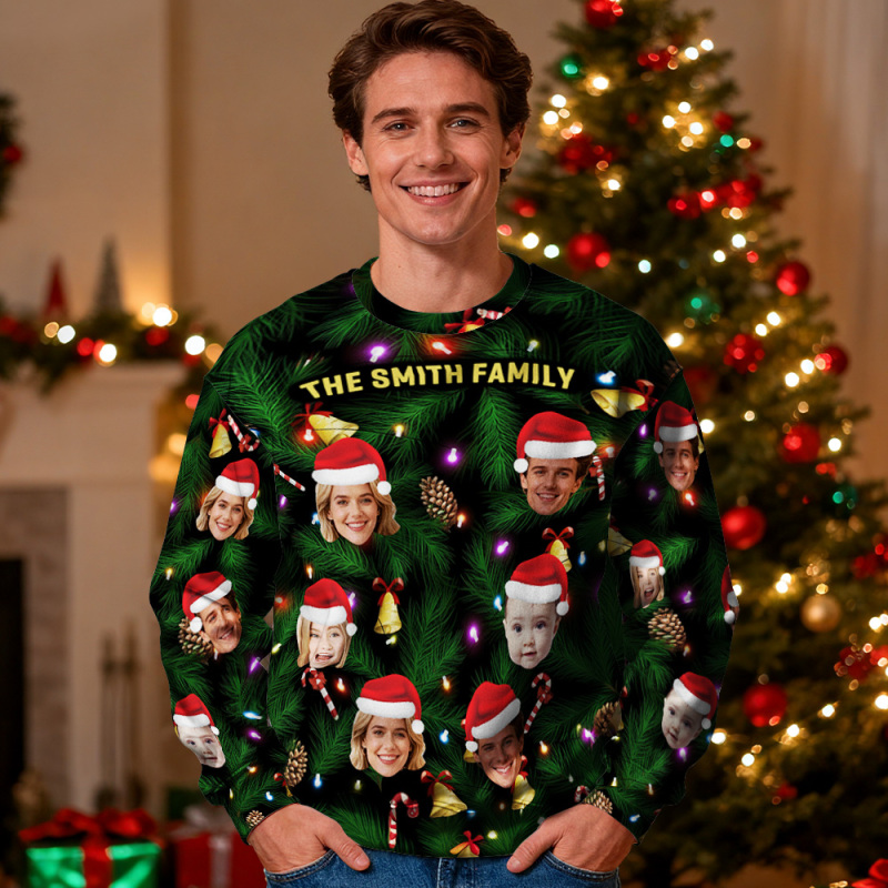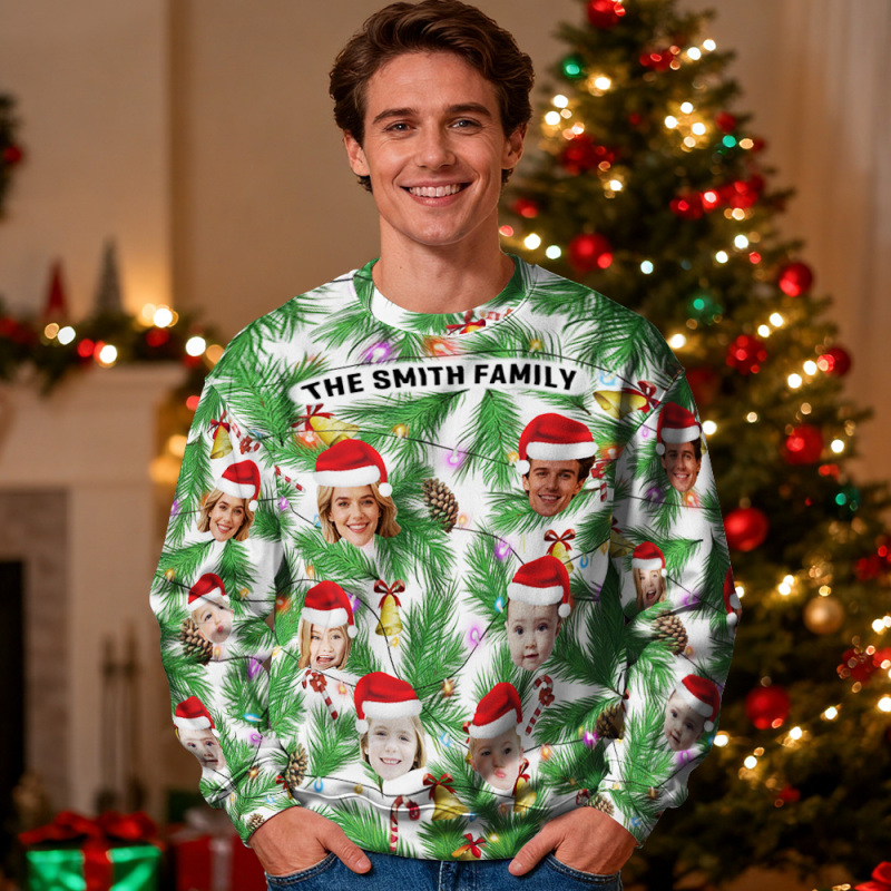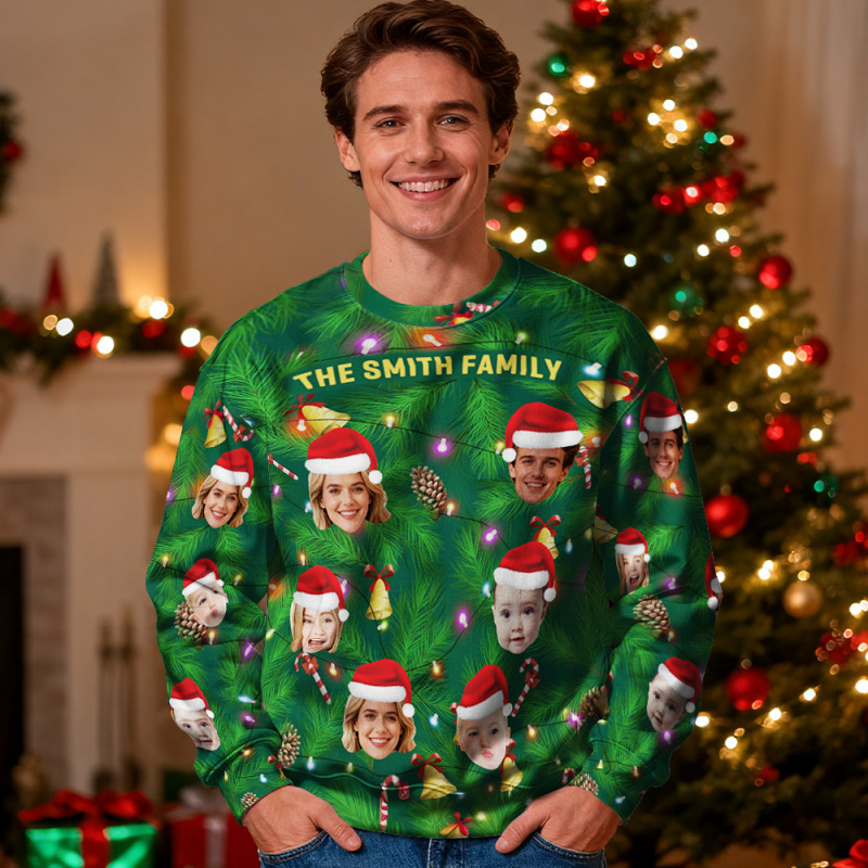 Custom Face Round Neck Hoodie Personalized Photo Gift For Family Christmas Light Bulbs Sweater