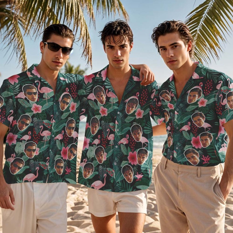 Custom Hawaiian Shirt Green Flower Flamingo Photo Hawaiian Shirt Funny Vacation Party Shirts
