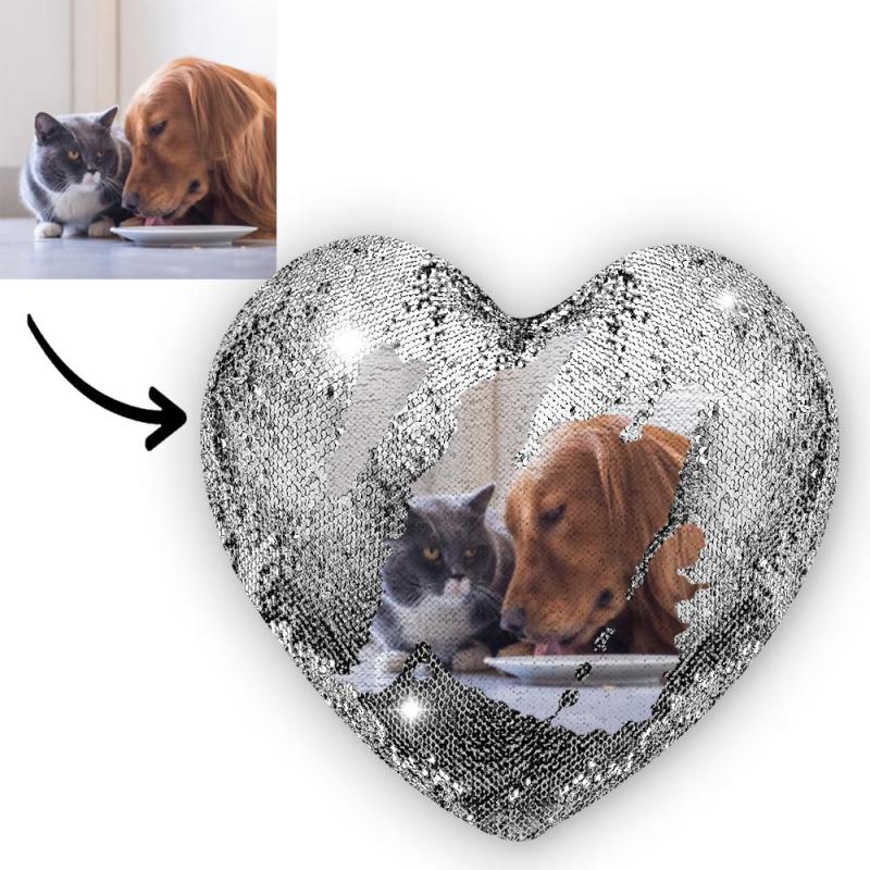 Custom Photo Magic Heart Sequins Pillow - Pet