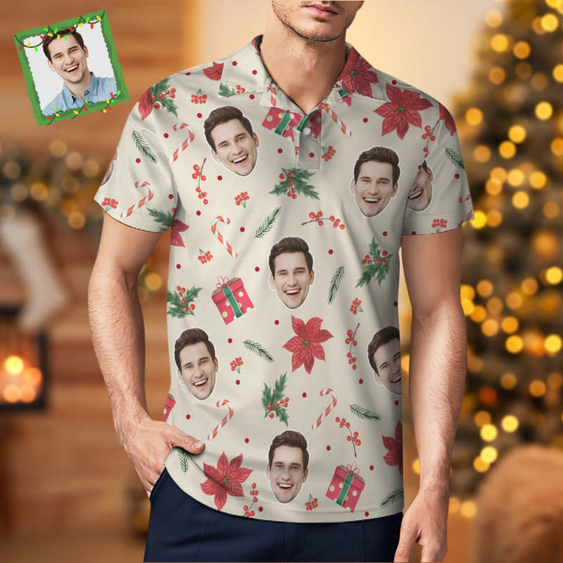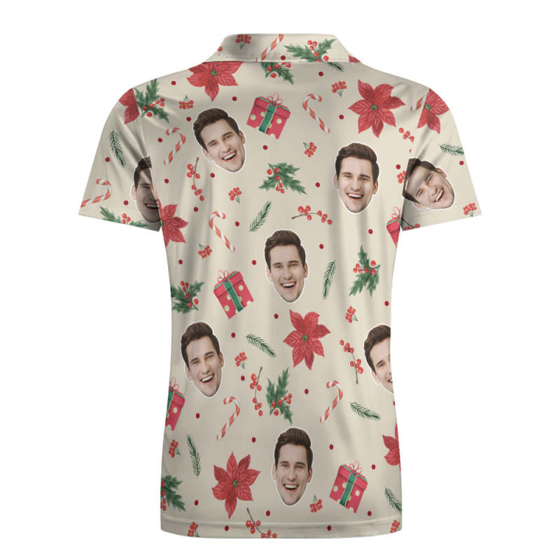 Custom Photo Vintage Short Sleeve Polo Shirt Personalized Christmas Elements Seamless Pattern Golf Shirt Mens Tops