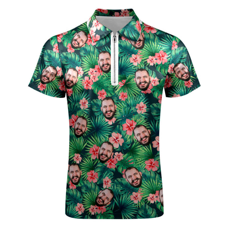 Custom Polo Shirt with Zipper Personalized Face Hawaiian Style Men's Polo Shirt