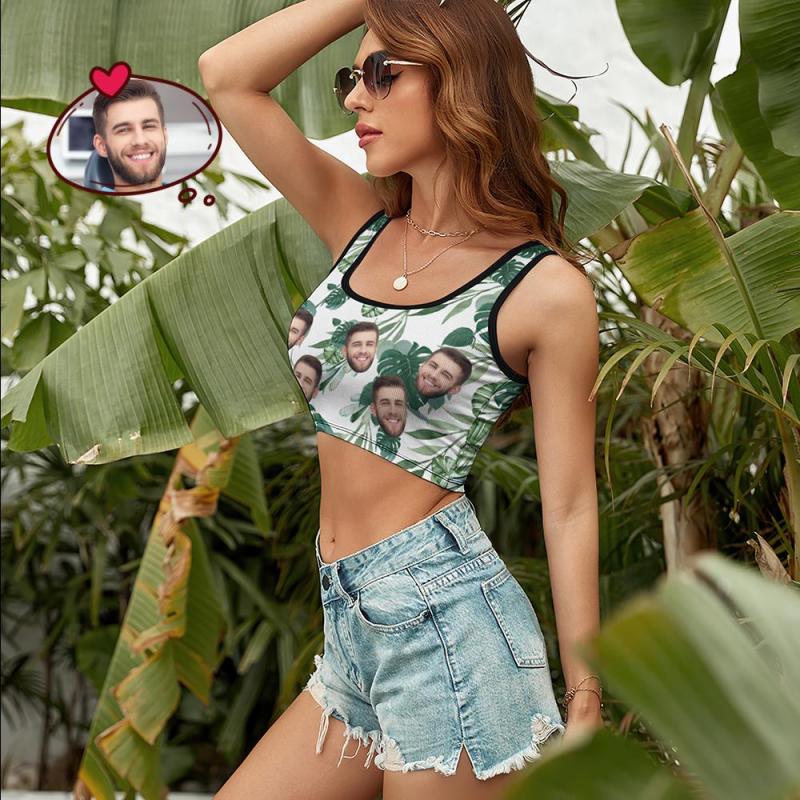 Custom Women's Photo Short Vest Personalised Face Tank Top Crop Top - Green Leaves