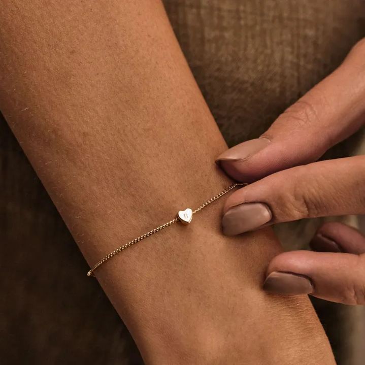 Minimalist 3D Heart Charm Bracelet, Custom Initial Bracelet, Engraved Letter Bracelet, Gold Bracelet, Daily Jewelry, Valentine Gift