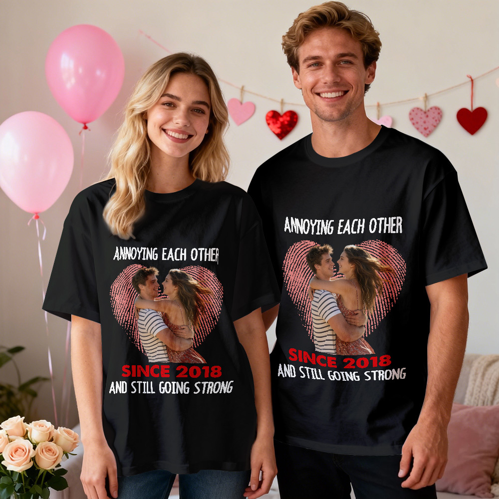 Personalized Couple Photo Tee Custom Photo T Shirt Heart-shaped Fingerprint Anniversary Valentine Gift For Couple