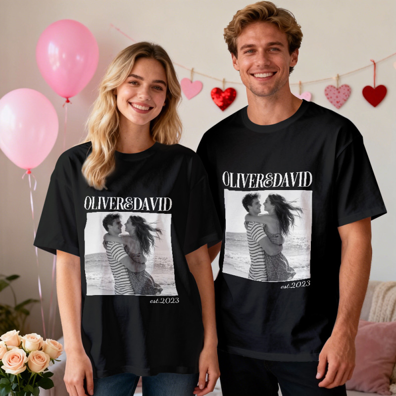 Personalized Couple Photo Tee Custom Photo T Shirt Name and Est Year Anniversary Valentine Gift For Her