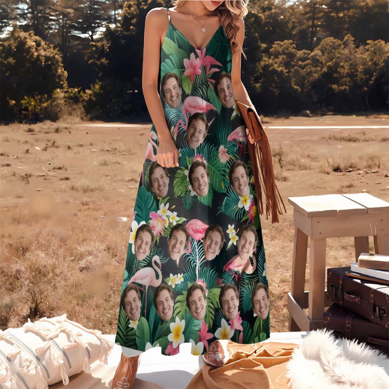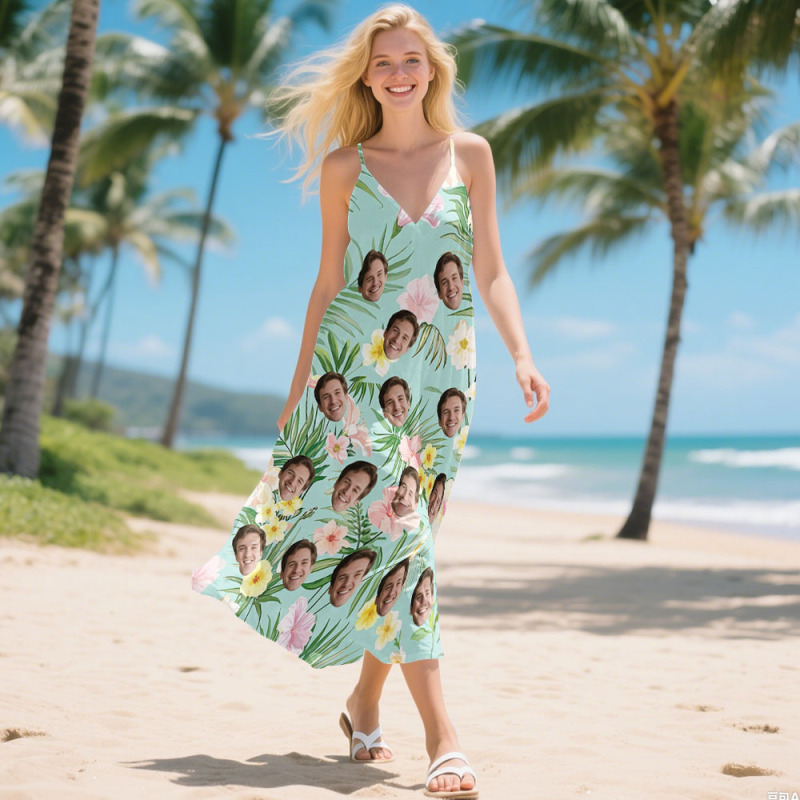 Personalized Pineapple FLowers Face Sling Long Dress Custom Face Photo Dress for Women Fun Summer Vacation Gift